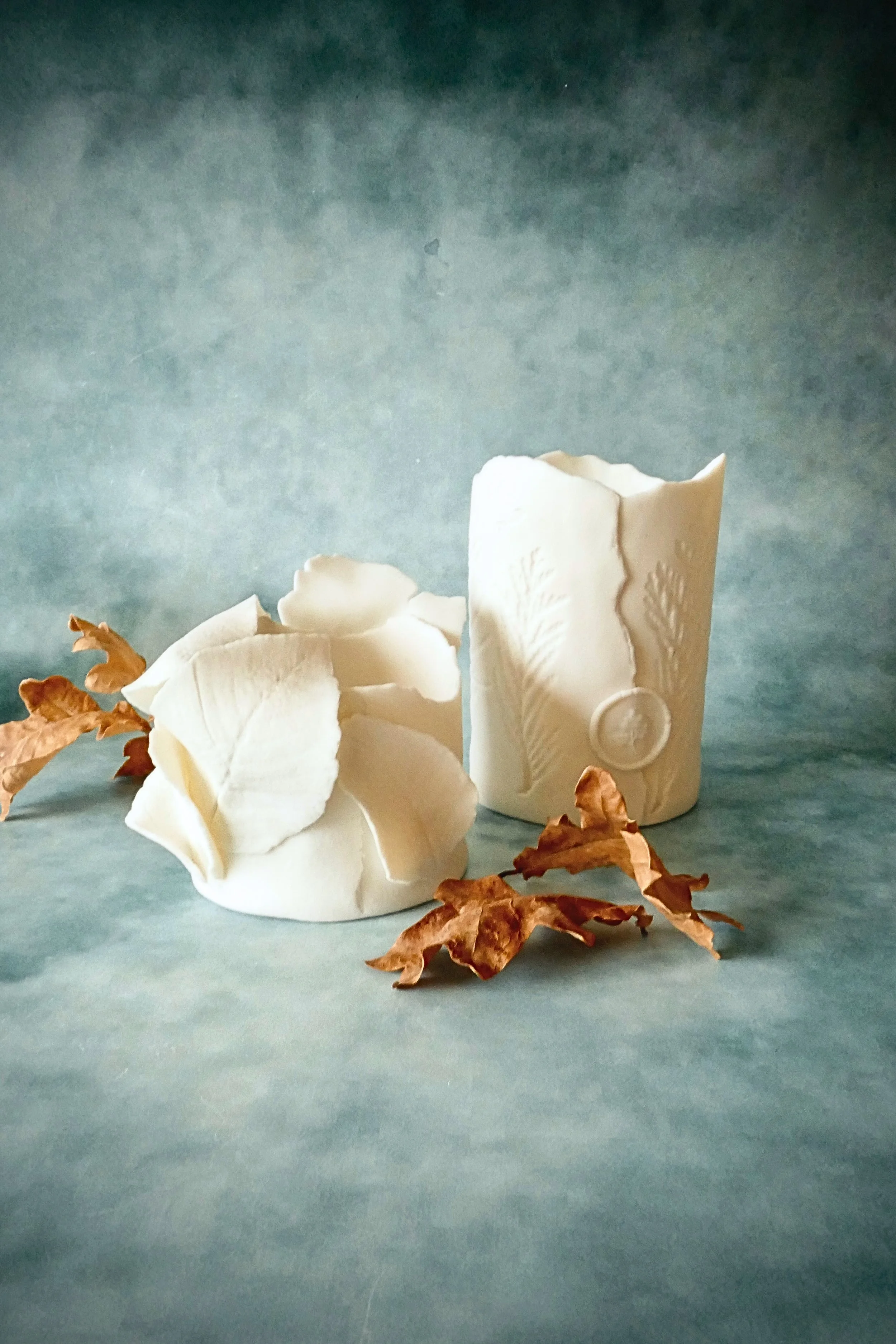 Autumn is a perfect season to create our own cozy lamp and candlelight holder in soft porcelain with natural imprints to capture the autumnal beauty.