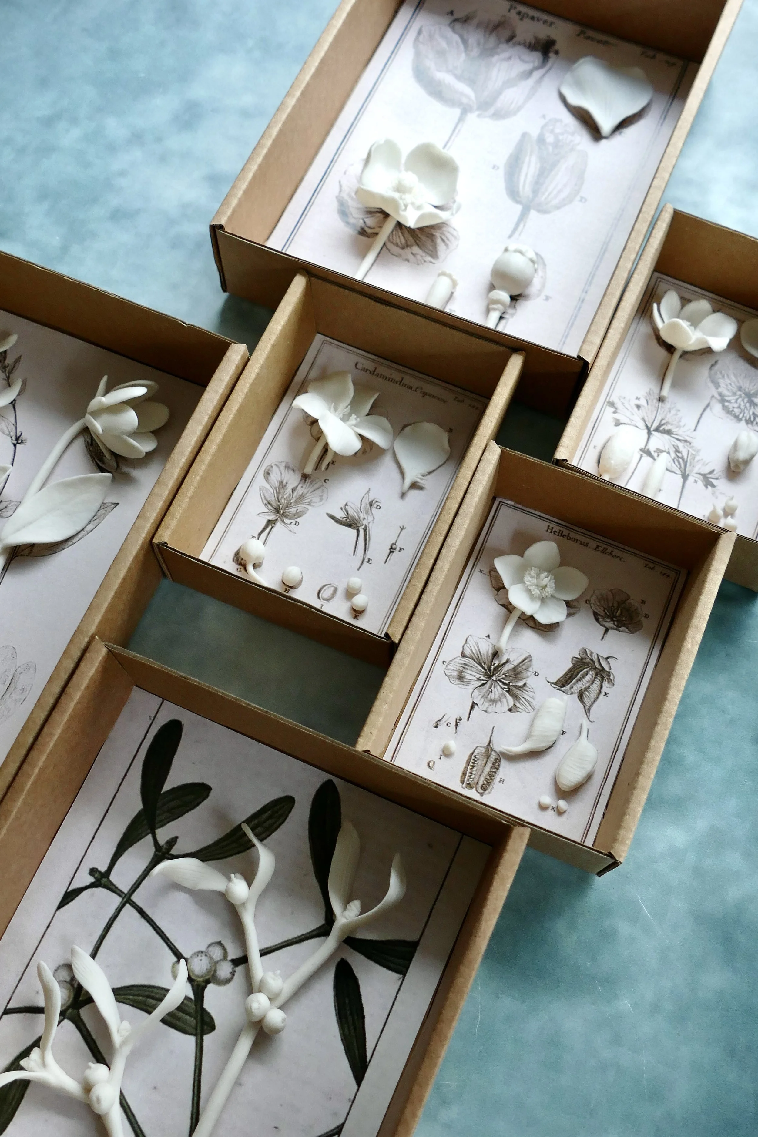 Every little detail of these flowers, stems, seedpods and seeds are hand modelled with fine porcelain and high fired. In the background of these cardboard boxes is a vintage botanical illustration.